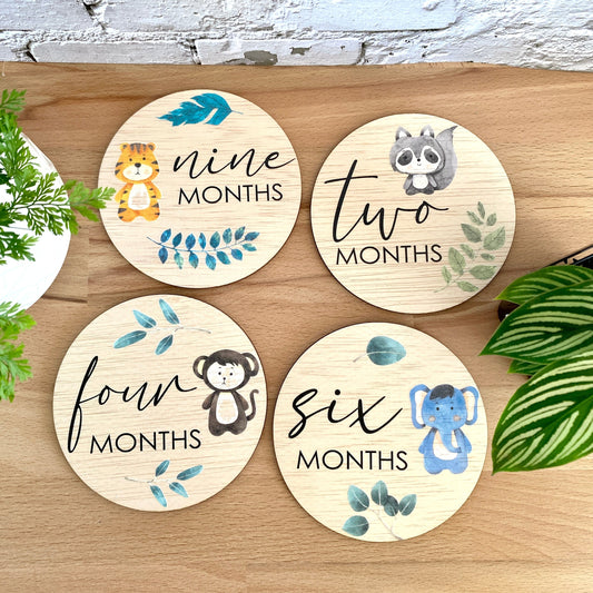 Baby Milestone Disc - Cute Jungle Safari Animals - wood